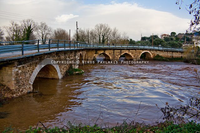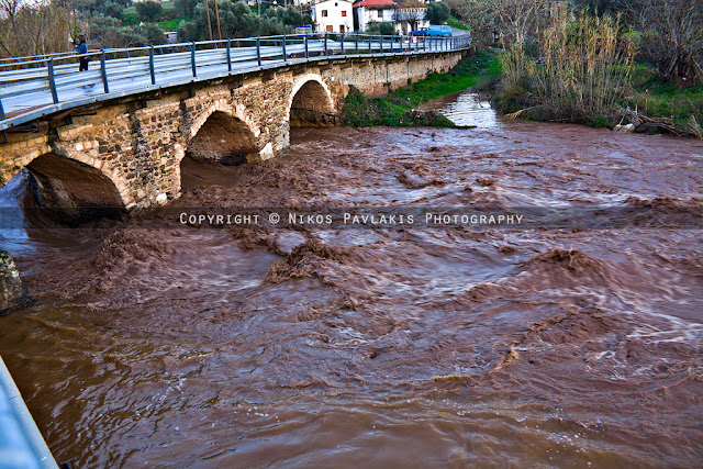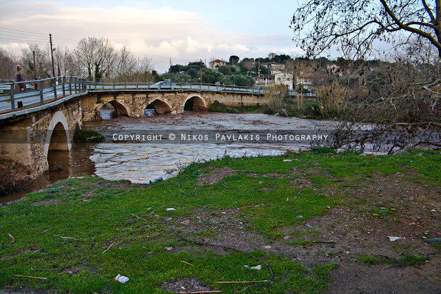 Το απόγευμα και ενώ ήδη το ποτάμι ήταν φουσκωμένο στα χειμωνιάτικά του επίπεδα, κατευθύνθηκα προς το παλιό γεφύρι αφού έβλεπα κόσμο να συγκεντρώνεται και να κοιτάζει την κοίτη. Το νερό είχε ανέβει αρκετά και σχημάτιζε δίνες και κύματα κατα μήκος της ροής επιδεικνύοντας τη δύναμη του για καταστροφή.